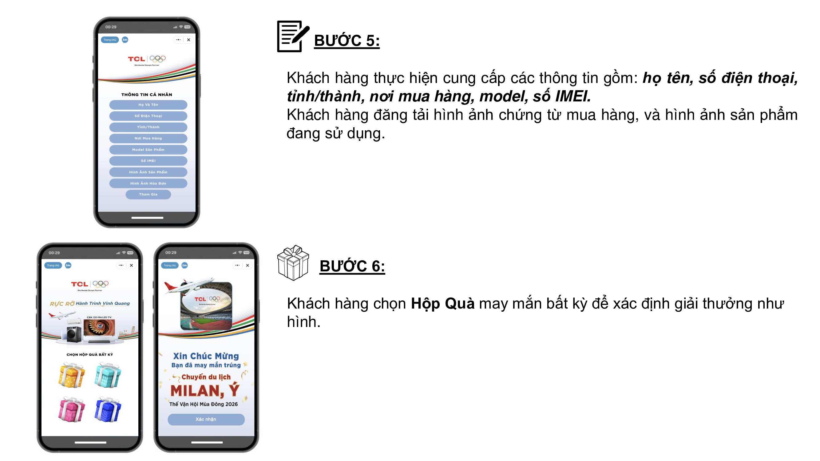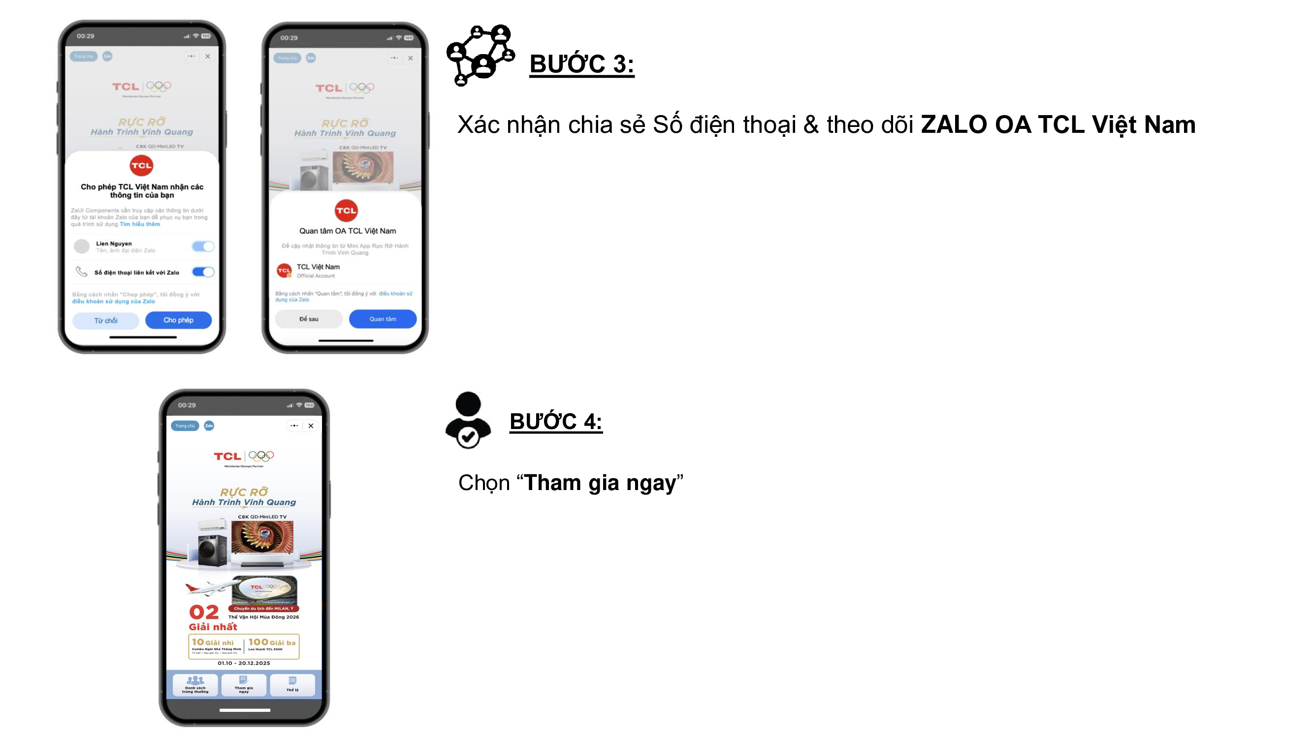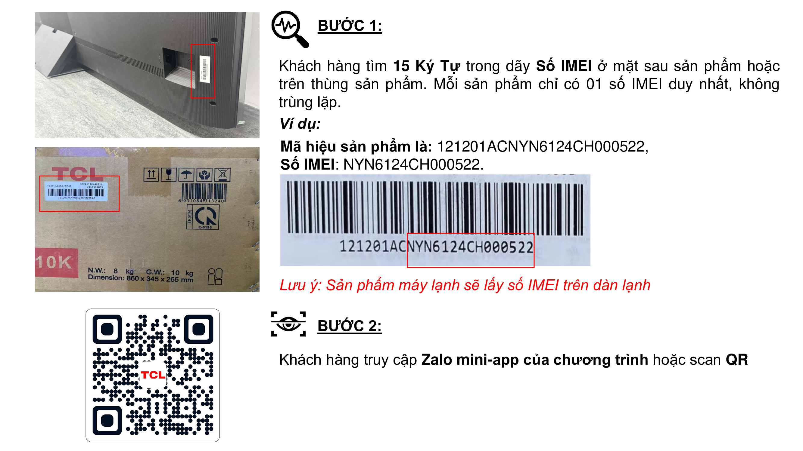 - Khách hàng tìm dãy số IMEI của sản phẩm ở mặt sau tivi, máy lạnh, máy giặt trên thùng sản phẩm. Mỗi sản phẩm chỉ có 01 số IMEI duy nhất, không trùng lặp. Khách hàng truy cập trực tiếp ứng dụng Zalo Mini App “Rực Rỡ Hành Trình Vinh Quang” hoặc scan mã QR trên các ấn phẩm quảng cáo để đăng ký tham gia chương trình bằng cách cung cấp các thông tin: họ tên, số điện thoại, tỉnh/thành, nơi mua hàng, model sản phẩm, số IMEI sản phẩm, hình ảnh sản phẩm đang sử dụng, hình ảnh hoá đơn mua hàng. Khách hàng tham gia cần đồng ý cho phép Zalo truy cập tài khoản, đọc Thể lệ chương trình khuyến mại và lựa chọn ô “Tôi đồng ý cung cấp thông tin cá nhân và cho phép Công ty TNHH Điện Tử Thông Minh TCL (Việt Nam) và nhà cung cấp có liên quan xử lý dữ liệu cá nhân của mình để tham dự chương trình, cũng như đồng ý với Thể lệ chương trình và Quan tâm Zalo OA TCL Việt Nam”. Trong đó, trường thông tin Số điện thoại được tự động điền theo thông tin tài khoản Zalo tham gia chương trình.