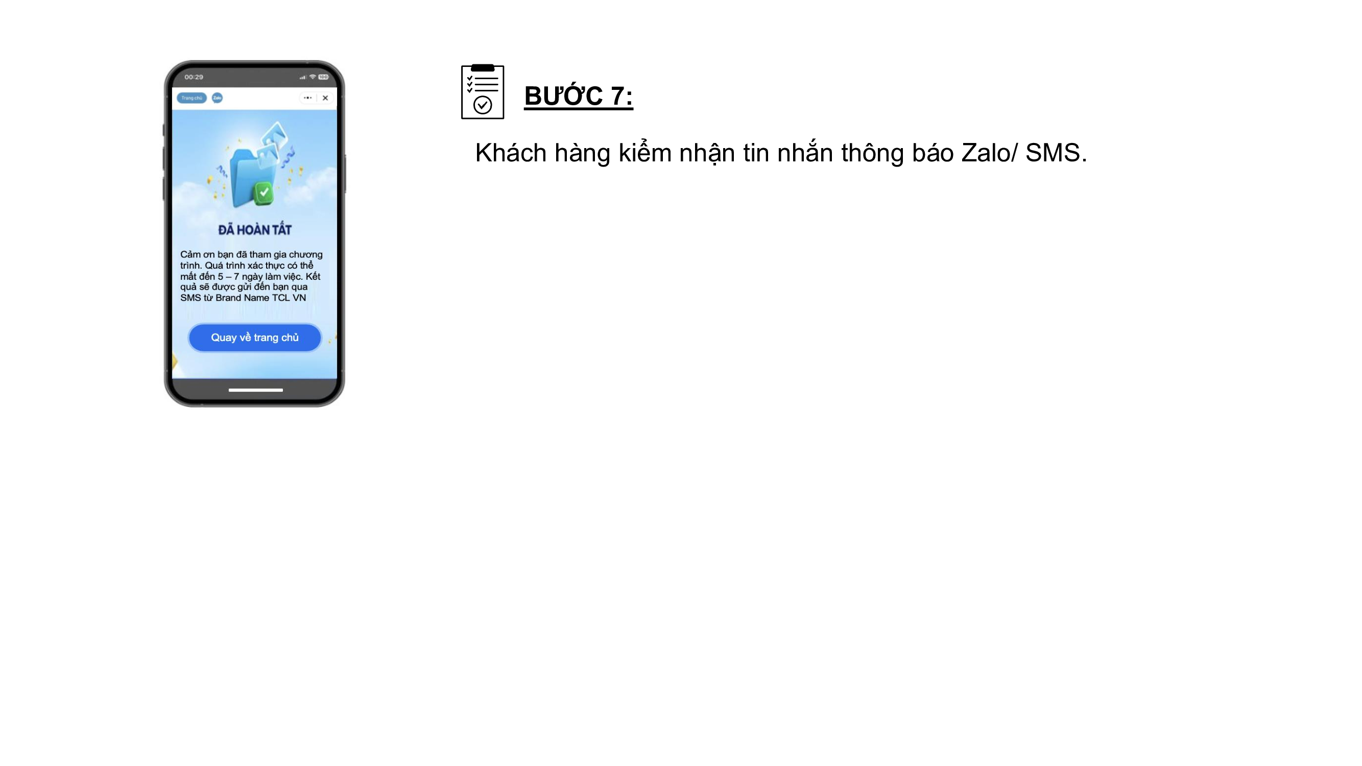 - Quá trình xác thực thông tin mất từ 5 - 7 ngày làm việc. Kết quả sẽ được gửi tin nhắn SMS cho khách hàng từ Brand Name TCL VN.
