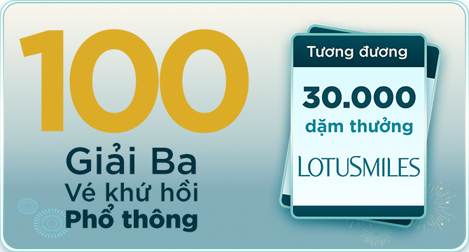 Mỗi Giải 1 Vé máy bay khứ hồi (tương đương 30,000 dặm thưởng Lotusmiles) Hãng hàng không: Vietnam Airline Hạng ghế: Phổ thông Phạm vi áp dụng: Các đường bay nội địa Giá vé: Bao gồm các khoản thuế, phí và phụ thu Thời hạn sử dụng: 12 tháng kể từ ngày nhận giải |