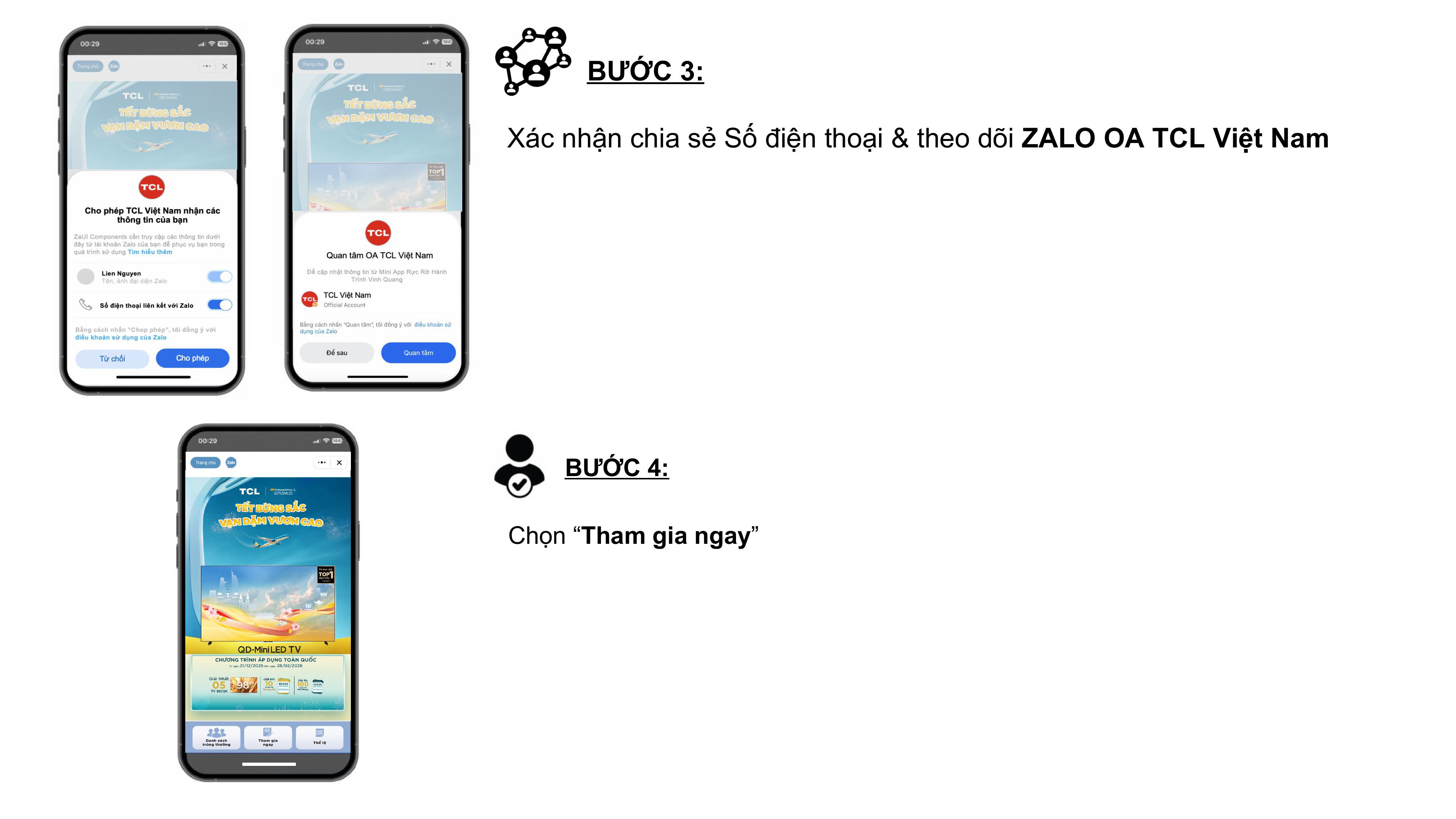 - Khách hàng tìm dãy số IMEI của sản phẩm ở mặt sau tivi, máy lạnh, máy giặt, trên thùng sản phẩm. Mỗi sản phẩm chỉ có 01 số IMEI duy nhất, không trùng lặp. Khách hàng truy cập trực tiếp ứng dụng Zalo Mini App “Tết Bừng Sắc, Vạn Dặm Vươn Cao” hoặc scan mã QR trên các ấn phẩm quảng cáo để đăng ký tham gia chương trình bằng cách cung cấp các thông tin: họ tên, số điện thoại, tỉnh/thành, nơi mua hàng, model sản phẩm, số IMEI sản phẩm, hình ảnh sản phẩm đang sử dụng, hình ảnh hoá đơn mua hàng. Khách hàng tham gia cần đồng ý cho phép Zalo truy cập tài khoản, đọc Thể lệ chương trình khuyến mại và lựa chọn ô “Tôi đồng ý cung cấp thông tin cá nhân và cho phép Công ty TNHH Điện Tử Thông Minh TCL (Việt Nam) và nhà cung cấp có liên quan xử lý dữ liệu cá nhân của mình để tham dự chương trình, cũng như đồng ý với Thể lệ chương trình và Quan tâm Zalo OA TCL Việt Nam”. Trong đó, trường thông tin Tên Zalo và Số điện thoại được tự động điền theo thông tin tài khoản Zalo tham gia chương trình.